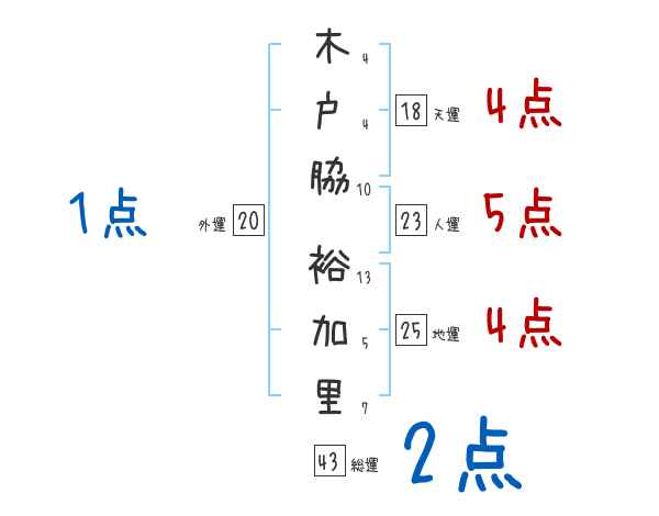 天運![]() | 木戸脇裕加里さんの天運は18画の4つ星!情熱的で剛気。忍耐力があり信頼される。 家系が持つ宿命的な運勢を表します。祖先から受け継いだ苗字ですので自分の力が及びません。家柄を象徴します。 |