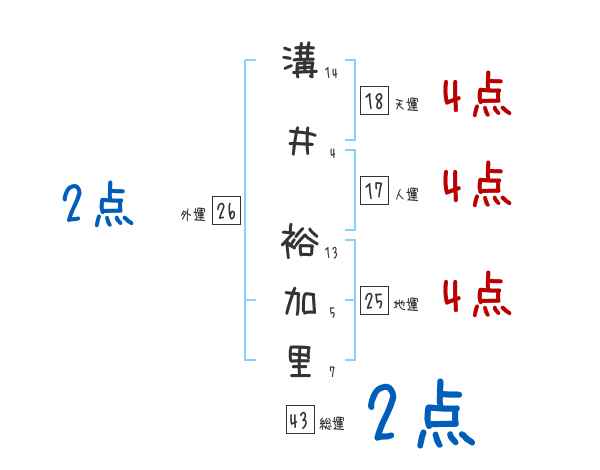 天運![]() | 溝井裕加里さんの天運は18画の4つ星!情熱的で剛気。忍耐力があり信頼される。 家系が持つ宿命的な運勢を表します。祖先から受け継いだ苗字ですので自分の力が及びません。家柄を象徴します。 |