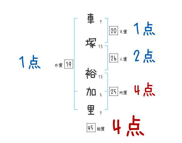 天運![]() | 車塚裕加里さんの天運は20画の1つ星!社交が苦手。人とは違った才能があり波乱万丈な人生かも。 家系が持つ宿命的な運勢を表します。祖先から受け継いだ苗字ですので自分の力が及びません。家柄を象徴します。 |