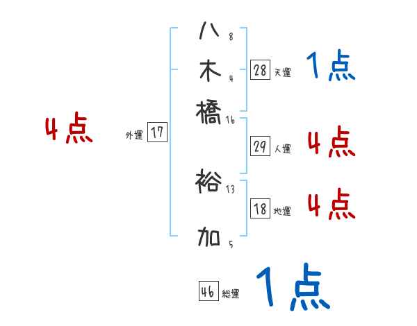 | 人運  | 八木橋裕加さんの人運は29画の4つ星!完全主義で才能がある。厳格な心の持ち主。性格や才能などを表す2番目に重要な運勢です。人間関係や協調性、社会的な成功に影響します。主に20歳から50歳ぐらいまでの中年期の運勢を表します。 |