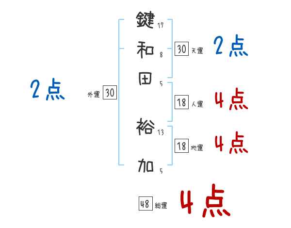 天運![]() | 鍵和田裕加さんの天運は30画の2つ星!浮き沈みの激しさに注意しましょう。 家系が持つ宿命的な運勢を表します。祖先から受け継いだ苗字ですので自分の力が及びません。家柄を象徴します。 |