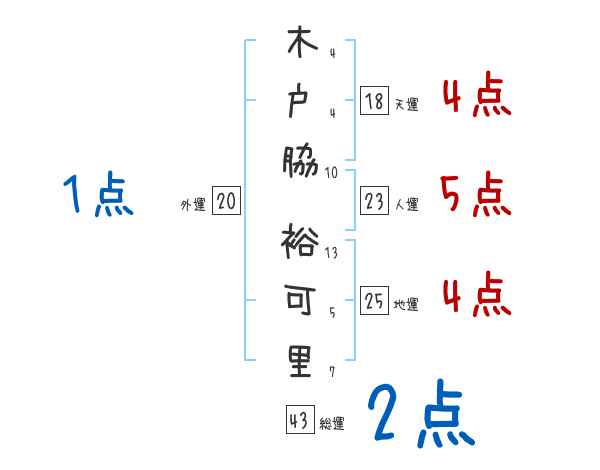 天運![]() | 木戸脇裕可里さんの天運は18画の4つ星!情熱的で剛気。忍耐力があり信頼される。 家系が持つ宿命的な運勢を表します。祖先から受け継いだ苗字ですので自分の力が及びません。家柄を象徴します。 |