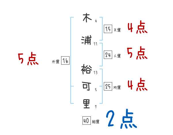 外運![]() | 木浦裕可里さんの外運は16画の5つ星!人望が厚く大きく発展する。逆転成功が見える。 生活面を象徴する運勢です。外部から受ける影響力を表し、結婚運、家庭運や職場、環境への順応性を表します。 |