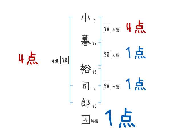 天運![]() | 小暮裕司郎さんの天運は18画の4つ星!情熱的で剛気。忍耐力があり信頼される。 家系が持つ宿命的な運勢を表します。祖先から受け継いだ苗字ですので自分の力が及びません。家柄を象徴します。 |