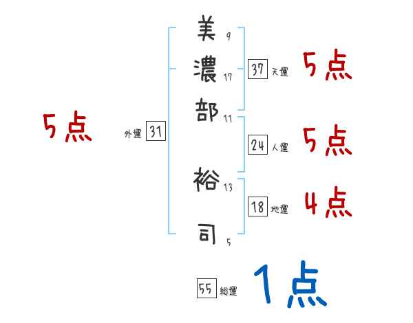 総運![]() | 美濃部裕司さんの総運は55画の1つ星!欲張りな性格で軽率な行動に注意しましょう。病気に気をつけて。 あなたの人生を表す1番重要な運勢です。生涯を通じて影響する総合運となり、主に50歳以降の晩年期に影響を及ぼします。 |
