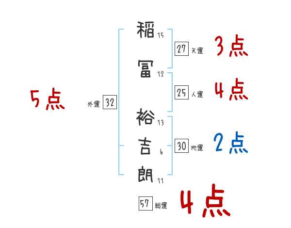 外運![]() | 稲冨裕吉朗さんの外運は32画の5つ星!柔軟性があり成功する。チャンスが多く金運が良い。 生活面を象徴する運勢です。外部から受ける影響力を表し、結婚運、家庭運や職場、環境への順応性を表します。 |
