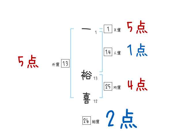 天運![]() | 一裕喜さんの天運は1画の5つ星!行動力、指導力があり出世し繁栄する。幸運に恵まれる。 家系が持つ宿命的な運勢を表します。祖先から受け継いだ苗字ですので自分の力が及びません。家柄を象徴します。 |