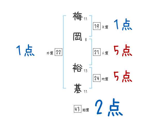 外運![]() | 梅岡裕基さんの外運は22画の1つ星!努力することが苦手ないっぽう手先が器用。芸術性にも優れる。 生活面を象徴する運勢です。外部から受ける影響力を表し、結婚運、家庭運や職場、環境への順応性を表します。 |