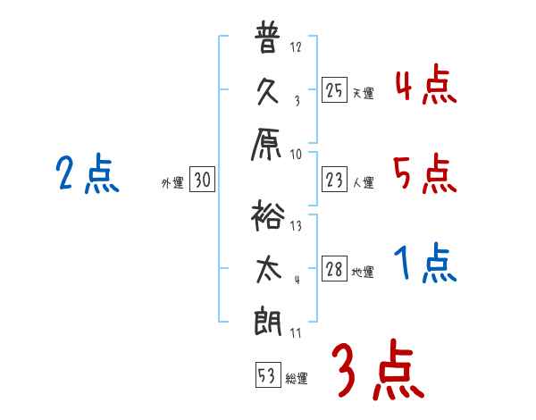 外運![]() | 普久原裕太朗さんの外運は30画の2つ星!浮き沈みの激しさに注意しましょう。 生活面を象徴する運勢です。外部から受ける影響力を表し、結婚運、家庭運や職場、環境への順応性を表します。 |