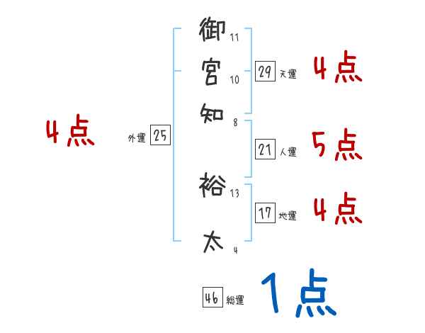 総運![]() | 御宮知裕太さんの総運は46画の1つ星!迷走することが多く苦労するかも。目先のことにとらわれないように。 あなたの人生を表す1番重要な運勢です。生涯を通じて影響する総合運となり、主に50歳以降の晩年期に影響を及ぼします。 |
