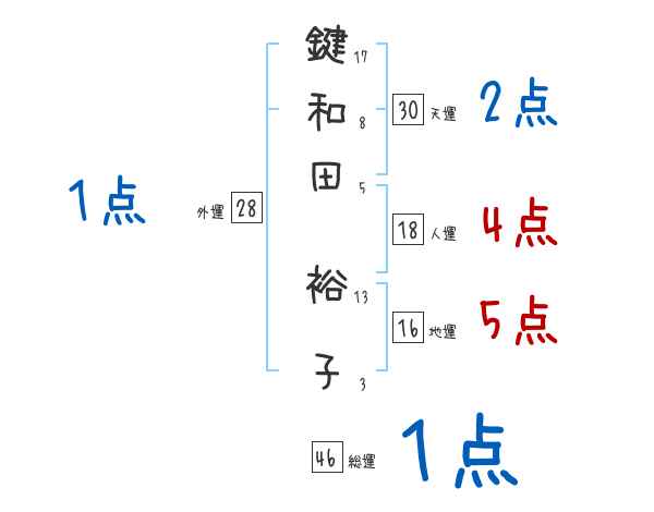 天運![]() | 鍵和田裕子さんの天運は30画の2つ星!浮き沈みの激しさに注意しましょう。 家系が持つ宿命的な運勢を表します。祖先から受け継いだ苗字ですので自分の力が及びません。家柄を象徴します。 |