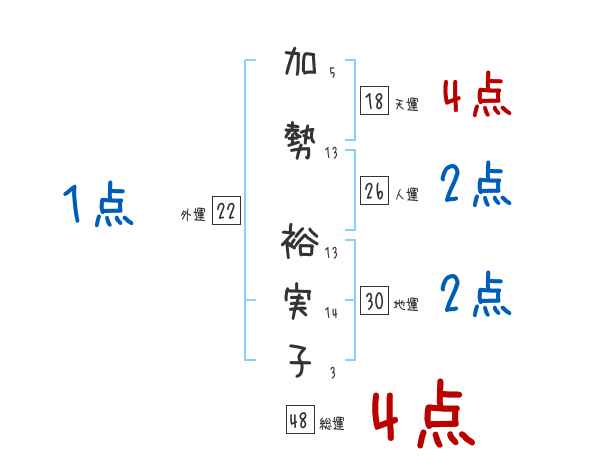 天運![]() | 加勢裕実子さんの天運は18画の4つ星!情熱的で剛気。忍耐力があり信頼される。 家系が持つ宿命的な運勢を表します。祖先から受け継いだ苗字ですので自分の力が及びません。家柄を象徴します。 |