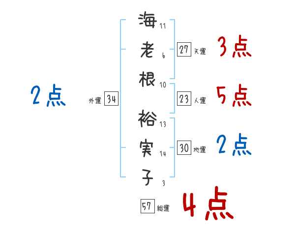 外運![]() | 海老根裕実子さんの外運は34画の2つ星!独創性に優れるが、自尊心が強く災難に注意しましょう。 生活面を象徴する運勢です。外部から受ける影響力を表し、結婚運、家庭運や職場、環境への順応性を表します。 |