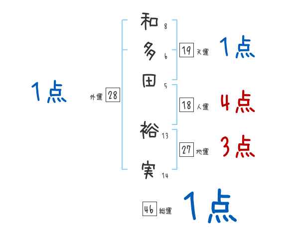 総運![]() | 和多田裕実さんの総運は46画の1つ星!迷走することが多く苦労するかも。目先のことにとらわれないように。 あなたの人生を表す1番重要な運勢です。生涯を通じて影響する総合運となり、主に50歳以降の晩年期に影響を及ぼします。 |