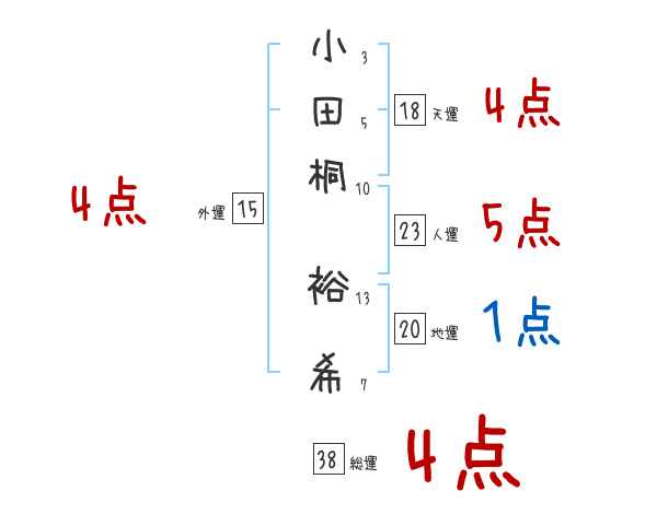 天運![]() | 小田桐裕希さんの天運は18画の4つ星!情熱的で剛気。忍耐力があり信頼される。 家系が持つ宿命的な運勢を表します。祖先から受け継いだ苗字ですので自分の力が及びません。家柄を象徴します。 |