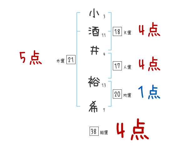 外運![]() | 小酒井裕希さんの外運は21画の5つ星!統率力がある。独立し成功する。名誉を手に入れる。 生活面を象徴する運勢です。外部から受ける影響力を表し、結婚運、家庭運や職場、環境への順応性を表します。 |