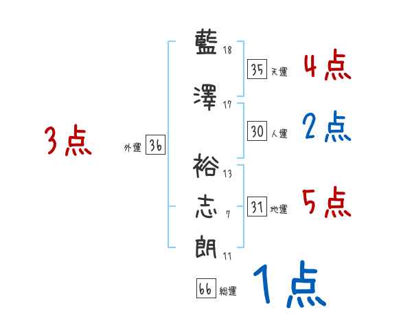 天運![]() | 藍澤裕志朗さんの天運は35画の4つ星!温厚な性格で感受性が高い。穏和な性格で人望が厚い。 家系が持つ宿命的な運勢を表します。祖先から受け継いだ苗字ですので自分の力が及びません。家柄を象徴します。 |