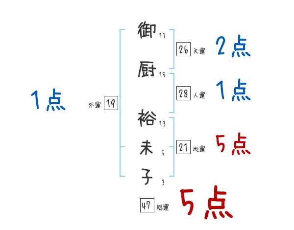 総運![]() | 御厨裕未子さんの総運は47画の5つ星!実力が開花し発展する円満な人生。財に恵まれる。 あなたの人生を表す1番重要な運勢です。生涯を通じて影響する総合運となり、主に50歳以降の晩年期に影響を及ぼします。 |
