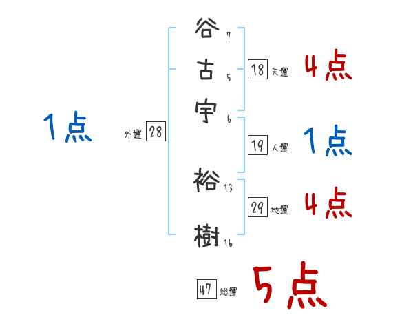 天運![]() | 谷古宇裕樹さんの天運は18画の4つ星!情熱的で剛気。忍耐力があり信頼される。 家系が持つ宿命的な運勢を表します。祖先から受け継いだ苗字ですので自分の力が及びません。家柄を象徴します。 |