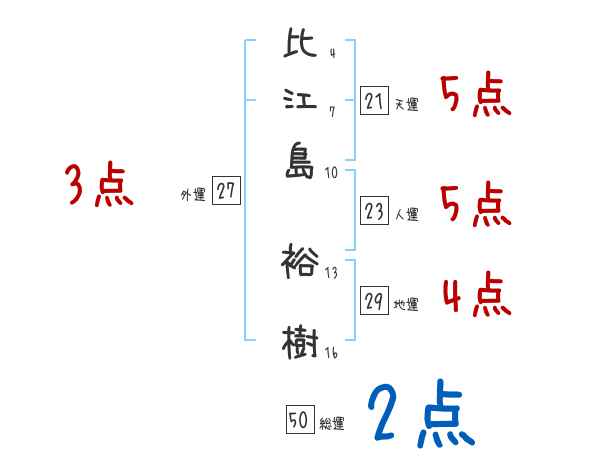 天運![]() | 比江島裕樹さんの天運は21画の5つ星!統率力がある。独立し成功する。名誉を手に入れる。 家系が持つ宿命的な運勢を表します。祖先から受け継いだ苗字ですので自分の力が及びません。家柄を象徴します。 |