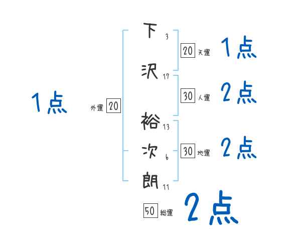 人運![]() | 下沢裕次朗さんの人運は30画の2つ星!浮き沈みの激しさに注意しましょう。 性格や才能などを表す2番目に重要な運勢です。人間関係や協調性、社会的な成功に影響します。主に20歳から50歳ぐらいまでの中年期の運勢を表します。 |