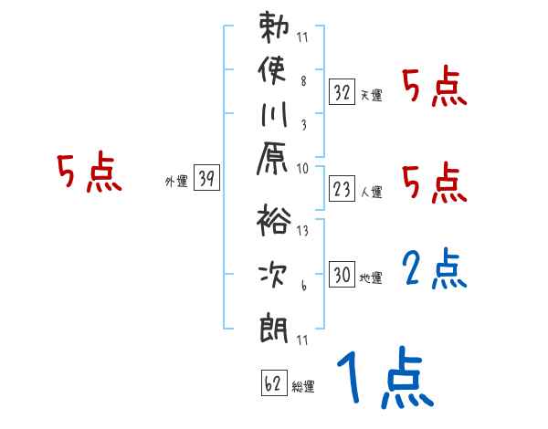 天運![]() | 勅使川原裕次朗さんの天運は32画の5つ星!柔軟性があり成功する。チャンスが多く金運が良い。 家系が持つ宿命的な運勢を表します。祖先から受け継いだ苗字ですので自分の力が及びません。家柄を象徴します。 |