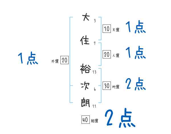天運![]() | 大住裕次朗さんの天運は10画の1つ星!不安を感じやすい傾向。ストレスを抱えないように注意しましょう。 家系が持つ宿命的な運勢を表します。祖先から受け継いだ苗字ですので自分の力が及びません。家柄を象徴します。 |