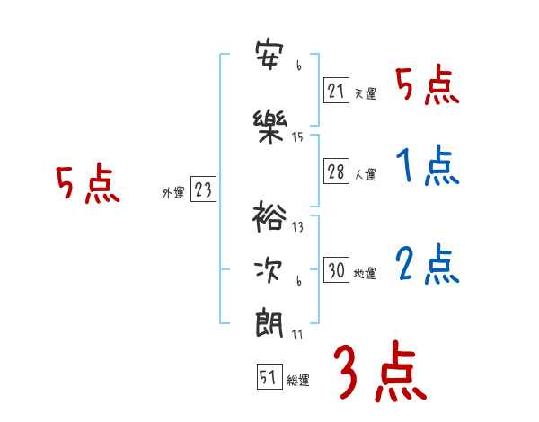 外運![]() | 安樂裕次朗さんの外運は23画の5つ星!想像力に優れ活力がある。一代で成功し名誉を手に入れる。 生活面を象徴する運勢です。外部から受ける影響力を表し、結婚運、家庭運や職場、環境への順応性を表します。 |