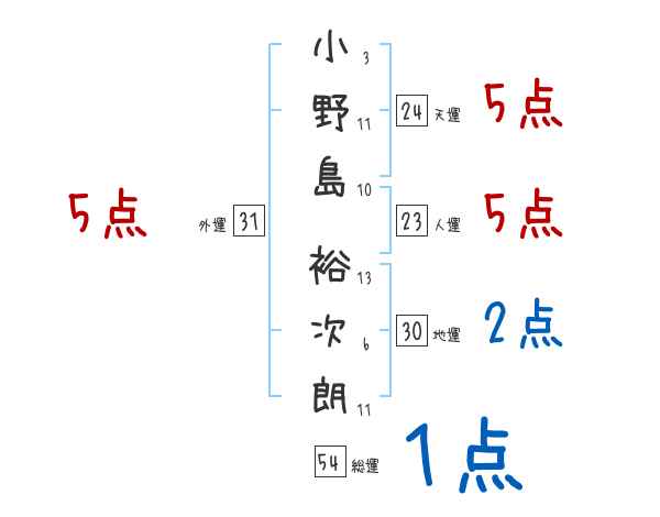 総運![]() | 小野島裕次朗さんの総運は54画の1つ星!トラブルが多いかも。周りをよく見て協調して過ごしましょう。 あなたの人生を表す1番重要な運勢です。生涯を通じて影響する総合運となり、主に50歳以降の晩年期に影響を及ぼします。 |