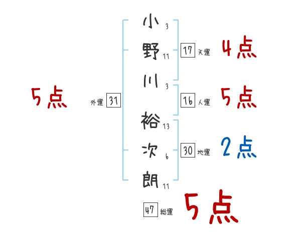 人運![]() | 小野川裕次朗さんの人運は16画の5つ星!人望が厚く大きく発展する。逆転成功が見える。 性格や才能などを表す2番目に重要な運勢です。人間関係や協調性、社会的な成功に影響します。主に20歳から50歳ぐらいまでの中年期の運勢を表します。 |