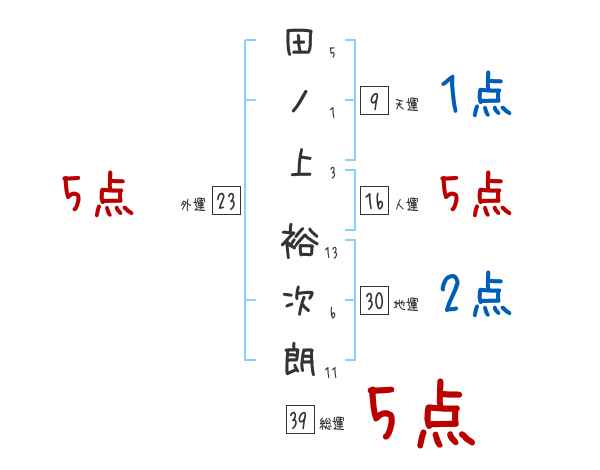 外運![]() | 田ノ上裕次朗さんの外運は23画の5つ星!想像力に優れ活力がある。一代で成功し名誉を手に入れる。 生活面を象徴する運勢です。外部から受ける影響力を表し、結婚運、家庭運や職場、環境への順応性を表します。 |