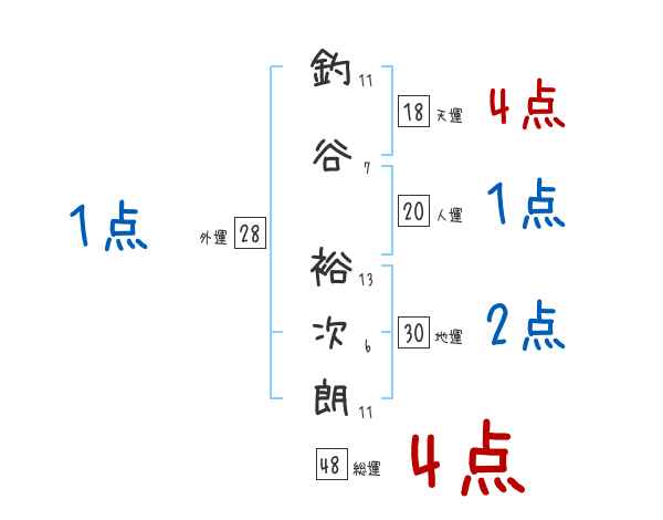 天運![]() | 釣谷裕次朗さんの天運は18画の4つ星!情熱的で剛気。忍耐力があり信頼される。 家系が持つ宿命的な運勢を表します。祖先から受け継いだ苗字ですので自分の力が及びません。家柄を象徴します。 |