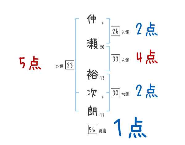 外運![]() | 仲瀬裕次朗さんの外運は23画の5つ星!想像力に優れ活力がある。一代で成功し名誉を手に入れる。 生活面を象徴する運勢です。外部から受ける影響力を表し、結婚運、家庭運や職場、環境への順応性を表します。 |