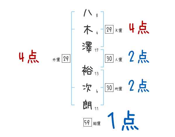 天運![]() | 八木澤裕次朗さんの天運は29画の4つ星!完全主義で才能がある。厳格な心の持ち主。 家系が持つ宿命的な運勢を表します。祖先から受け継いだ苗字ですので自分の力が及びません。家柄を象徴します。 |