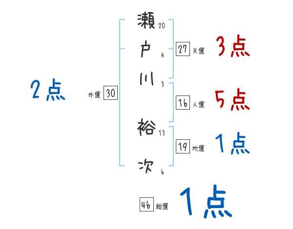 総運![]() | 瀬戸川裕次さんの総運は46画の1つ星!迷走することが多く苦労するかも。目先のことにとらわれないように。 あなたの人生を表す1番重要な運勢です。生涯を通じて影響する総合運となり、主に50歳以降の晩年期に影響を及ぼします。 |