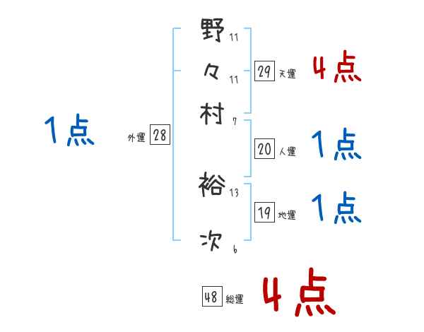 外運![]() | 野々村裕次さんの外運は28画の1つ星!家庭環境に注意。スポーツで活躍できる能力があるかも。 生活面を象徴する運勢です。外部から受ける影響力を表し、結婚運、家庭運や職場、環境への順応性を表します。 |