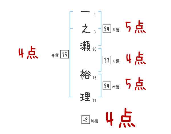 天運![]() | 一之瀬裕理さんの天運は24画の5つ星!家庭運が良く順調な人生。金運にも恵まれる。 家系が持つ宿命的な運勢を表します。祖先から受け継いだ苗字ですので自分の力が及びません。家柄を象徴します。 |