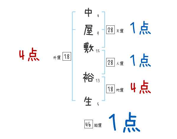 天運![]() | 中屋敷裕生さんの天運は28画の1つ星!家庭環境に注意。スポーツで活躍できる能力があるかも。 家系が持つ宿命的な運勢を表します。祖先から受け継いだ苗字ですので自分の力が及びません。家柄を象徴します。 |