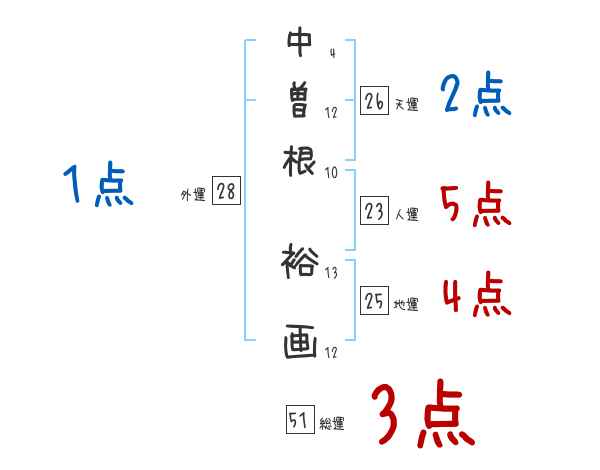 天運![]() | 中曽根裕画さんの天運は26画の2つ星!波瀾万丈かも。信頼できる人を大事にしましょう。 家系が持つ宿命的な運勢を表します。祖先から受け継いだ苗字ですので自分の力が及びません。家柄を象徴します。 |