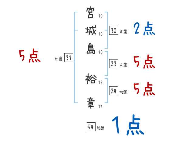 天運![]() | 宮城島裕章さんの天運は30画の2つ星!浮き沈みの激しさに注意しましょう。 家系が持つ宿命的な運勢を表します。祖先から受け継いだ苗字ですので自分の力が及びません。家柄を象徴します。 |