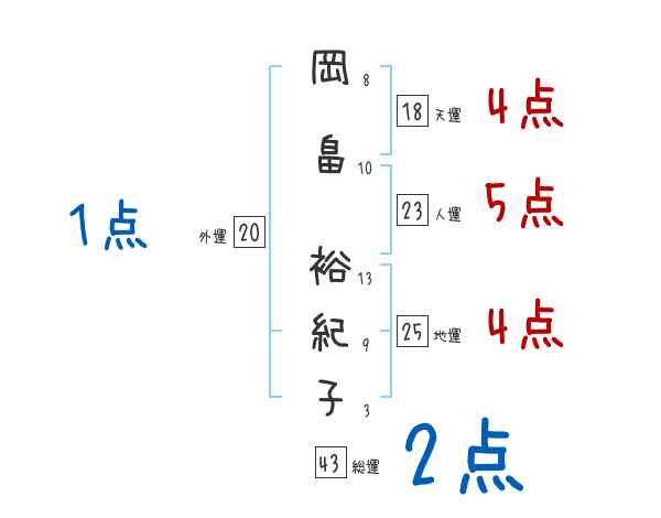 天運![]() | 岡畠裕紀子さんの天運は18画の4つ星!情熱的で剛気。忍耐力があり信頼される。 家系が持つ宿命的な運勢を表します。祖先から受け継いだ苗字ですので自分の力が及びません。家柄を象徴します。 |