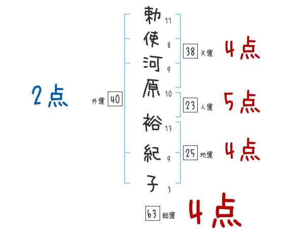 天運![]() | 勅使河原裕紀子さんの天運は38画の4つ星!温厚な性格で技術的な才能を発揮する。職人的な仕事に向いている。 家系が持つ宿命的な運勢を表します。祖先から受け継いだ苗字ですので自分の力が及びません。家柄を象徴します。 |