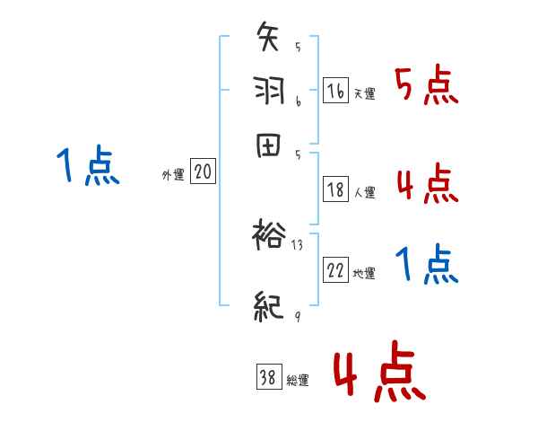 天運![]() | 矢羽田裕紀さんの天運は16画の5つ星!人望が厚く大きく発展する。逆転成功が見える。 家系が持つ宿命的な運勢を表します。祖先から受け継いだ苗字ですので自分の力が及びません。家柄を象徴します。 |