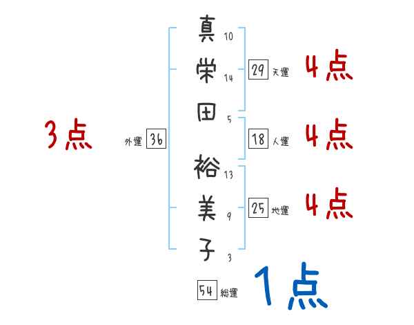 天運![]() | 真栄田裕美子さんの天運は29画の4つ星!完全主義で才能がある。厳格な心の持ち主。 家系が持つ宿命的な運勢を表します。祖先から受け継いだ苗字ですので自分の力が及びません。家柄を象徴します。 |
