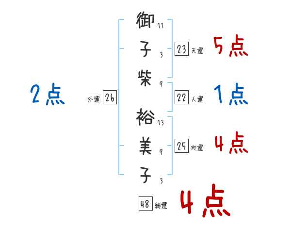 外運![]() | 御子柴裕美子さんの外運は26画の2つ星!波瀾万丈かも。信頼できる人を大事にしましょう。 生活面を象徴する運勢です。外部から受ける影響力を表し、結婚運、家庭運や職場、環境への順応性を表します。 |