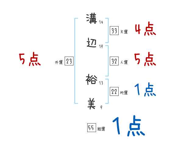 人運![]() | 溝辺裕美さんの人運は32画の5つ星!柔軟性があり成功する。チャンスが多く金運が良い。 性格や才能などを表す2番目に重要な運勢です。人間関係や協調性、社会的な成功に影響します。主に20歳から50歳ぐらいまでの中年期の運勢を表します。 |