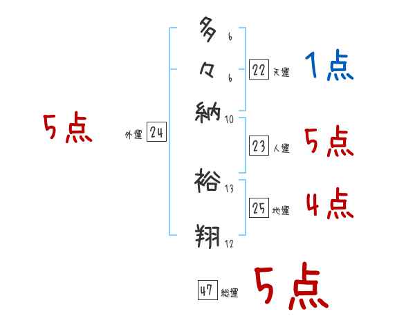 総運![]() | 多々納裕翔さんの総運は47画の5つ星!実力が開花し発展する円満な人生。財に恵まれる。 あなたの人生を表す1番重要な運勢です。生涯を通じて影響する総合運となり、主に50歳以降の晩年期に影響を及ぼします。 |