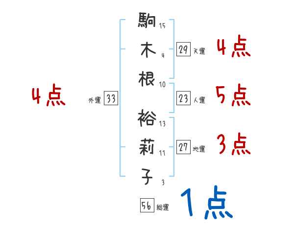 外運![]() | 駒木根裕莉子さんの外運は33画の4つ星!権力志向でプライドが高い。勇気があり運を切り開き成功する。 生活面を象徴する運勢です。外部から受ける影響力を表し、結婚運、家庭運や職場、環境への順応性を表します。 |