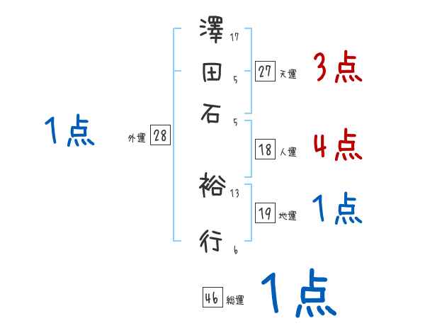 総運![]() | 澤田石裕行さんの総運は46画の1つ星!迷走することが多く苦労するかも。目先のことにとらわれないように。 あなたの人生を表す1番重要な運勢です。生涯を通じて影響する総合運となり、主に50歳以降の晩年期に影響を及ぼします。 |