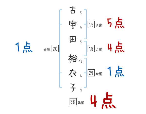 天運![]() | 古宇田裕衣子さんの天運は16画の5つ星!人望が厚く大きく発展する。逆転成功が見える。 家系が持つ宿命的な運勢を表します。祖先から受け継いだ苗字ですので自分の力が及びません。家柄を象徴します。 |